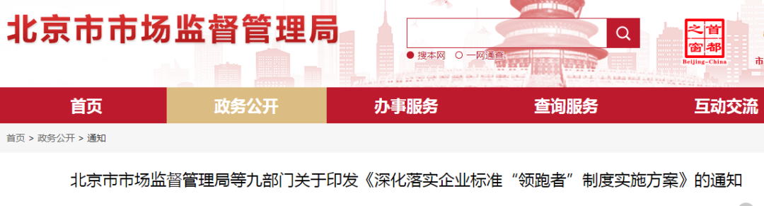 為落實(shí)《中共北京市委 北京市人民政府關(guān)于加快培育壯大新業(yè)態(tài)新模式促進(jìn)北京經(jīng)濟(jì)高質(zhì)量發(fā)展的若干意見》,按照《市場監(jiān)管總局等八部門關(guān)于實(shí)施企業(yè)標(biāo)準(zhǔn)“領(lǐng)跑者”制度的意見》要求,市市場監(jiān)管局等九部門制定了《深化落實(shí)企業(yè)標(biāo)準(zhǔn)“領(lǐng)跑者”制度實(shí)施方案》,經(jīng)市政府批準(zhǔn),現(xiàn)印發(fā)給你們。請認(rèn)真貫徹落實(shí),鼓勵(lì)企業(yè)創(chuàng)制先進(jìn)標(biāo)準(zhǔn),促進(jìn)新業(yè)態(tài)新模式發(fā)展壯大,以高標(biāo)準(zhǔn)推動(dòng)北京經(jīng)濟(jì)高質(zhì)量發(fā)展。