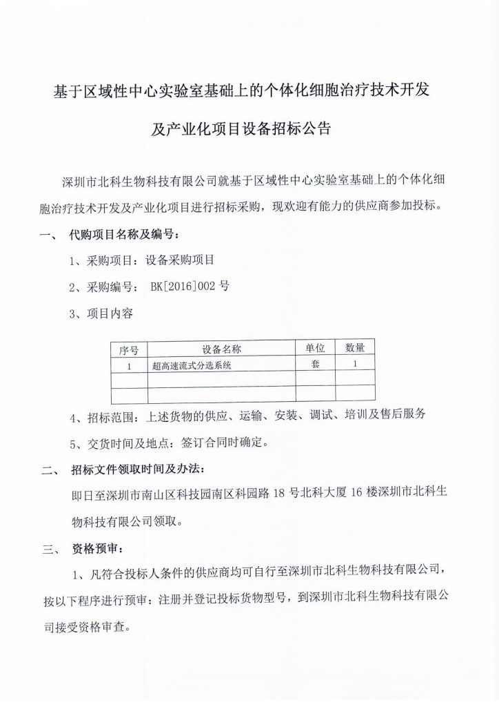 基于區(qū)域性中心實(shí)驗(yàn)室基礎(chǔ)上的個(gè)體化細(xì)胞治療技術(shù)開發(fā)及產(chǎn)業(yè)化項(xiàng)目設(shè)備招標(biāo)公告