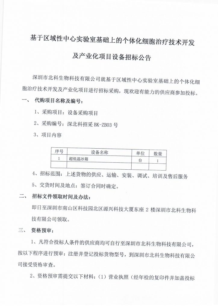 基于區(qū)域性中心實驗室基礎(chǔ)上的個體化細(xì)胞治療技術(shù)開發(fā)及產(chǎn)業(yè)化項目設(shè)備招標(biāo)公告