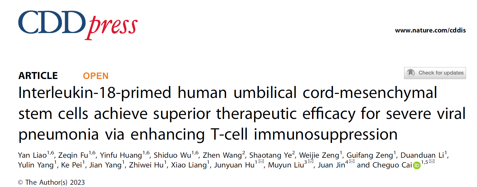 2023年1月28日,深圳市北科生物科技有限公司研發(fā)中心蔡車國教授和廖延博士團(tuán)隊(duì)在國際權(quán)威學(xué)術(shù)期刊《Cell Death & Disease》(影響因子=9.68,中科院一區(qū))在線發(fā)表關(guān)于炎癥因子IL-18賦能型臍帶間充質(zhì)干細(xì)胞可增強(qiáng)針對重癥病毒性肺炎導(dǎo)致肺損傷治療效果的研究成果。論文題為:“Interleukin-18-primed human umbilical cord-mesenchymal stem cells achieve superior therapeutic efficacy for severe viral pneumonia via enhancing T-cell immunosuppression”。近年來。北科生物科研成果轉(zhuǎn)化穩(wěn)步提升,不僅體現(xiàn)在“量的增長”上,更體現(xiàn)在“質(zhì)的飛躍”上。北科生物在高水平論文,尤其是國際權(quán)威期刊的學(xué)術(shù)論文發(fā)表方面不斷取得突破, 正是其科研實(shí)力和技術(shù)創(chuàng)新方面的實(shí)力體現(xiàn)。
